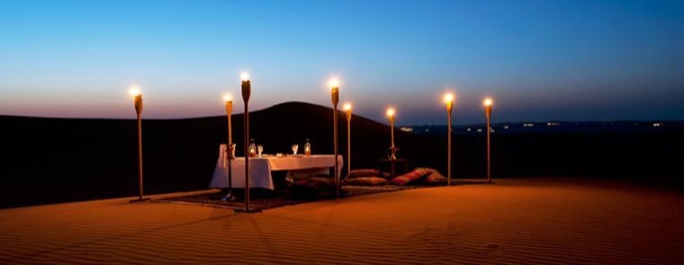 As the sun begins to set, casting a warm golden glow across the landscape, we invite you to step into a world of enchantment. Our expert team will create an exquisite dining setup amidst the soft sand dunes, ensuring every detail is thoughtfully arranged. Picture elegant tables adorned with fine linens, flickering candles casting a warm glow, and comfortable seating where you can relax and immerse yourself in the tranquil ambiance of the desert.